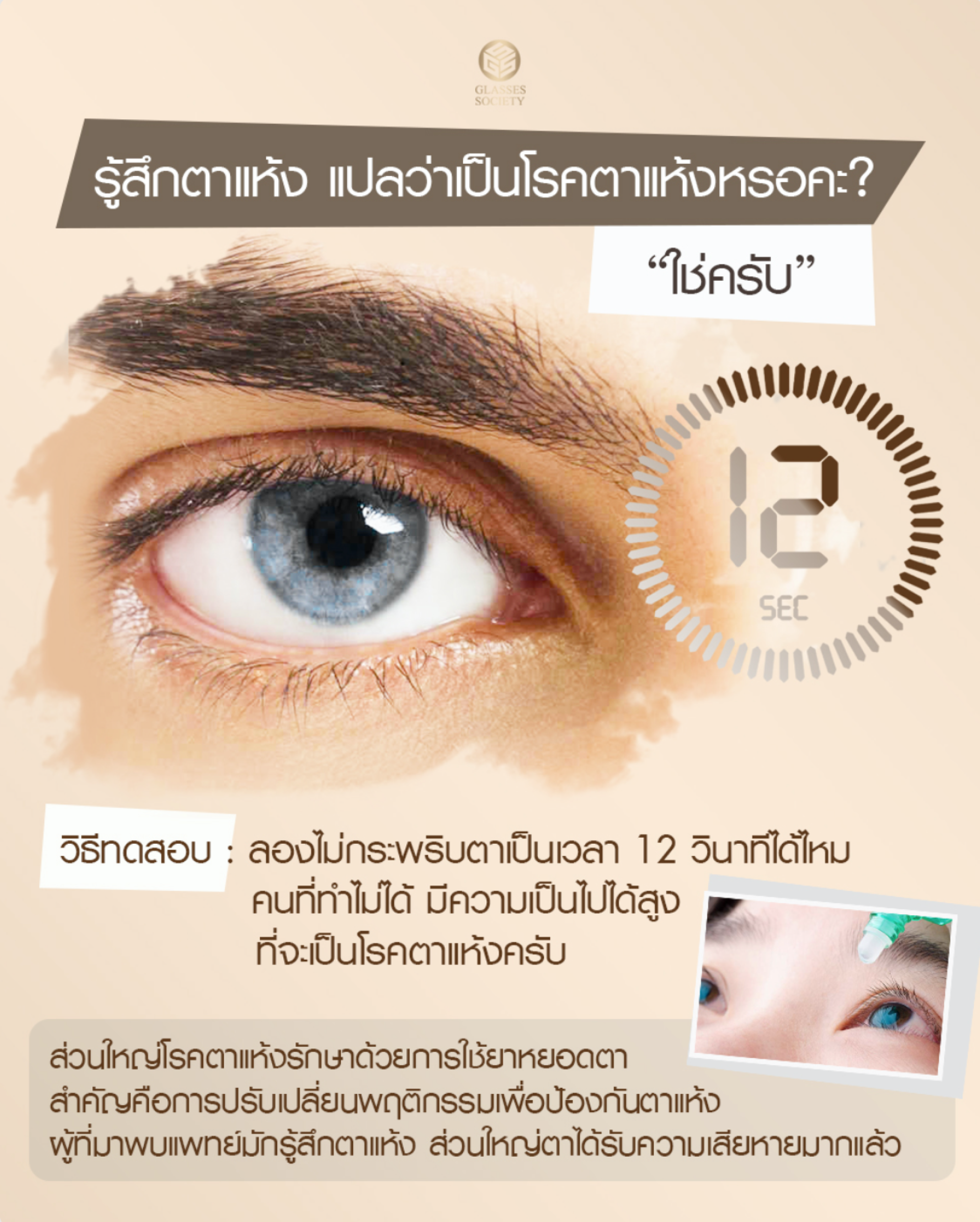 "เพราะฉะนั้นวิธีทดสอบง่ายๆนะครับ คือ ลองไม่กระพริบตาเป็นเวลา 12 วินาทีคนที่ทำไม่ได้มีความเสี่ยงสูงที่จะเป็นโรคตาแห้ง ส่วนใหญ่โรคตาแห้งรักษาด้วยการใช้ยาหยอดตา สิ่งสำคัญคือการปรับเปลี่ยนพฤติกรรมเพื่อป้องกันอาการตาแห้ง"