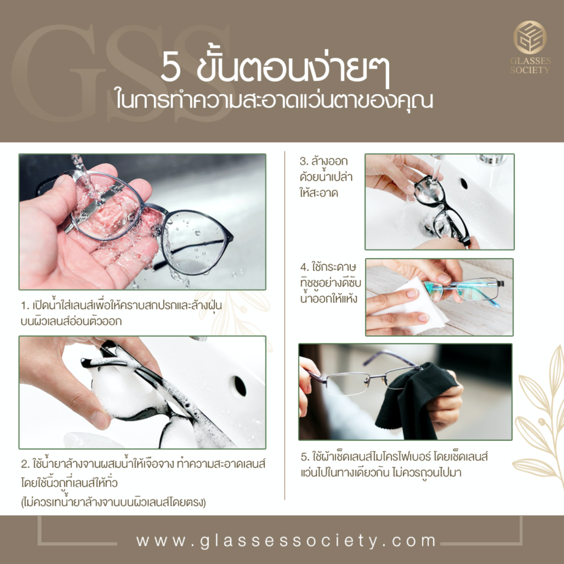 ควรเช็ดทำความสะอาดเลนส์ด้วยน้ำยาเคลือบผิวทุกวันและล้างกรอบแว่นอย่างน้อยสัปดาห์ละครั้งนะคะ